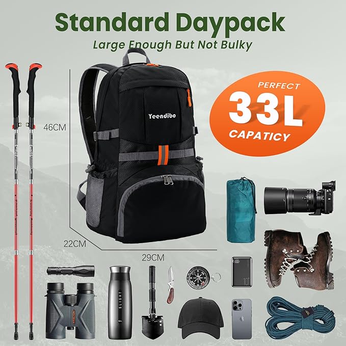 • Just the Right Capacity:With a 33L capacity and unfolded size of 29*22*46cm, this backpack great for day trips, hiking, camping, or short travels, offering ample space for your necessitie