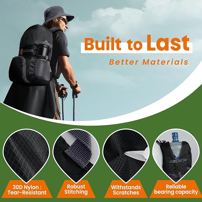 • Waterproof and Durable:Crafted from tear-resistant 30D nylon withstands scratches from branches and stones. Its water-resistant coating ensures that the contents inside remain dry, even in wet conditions