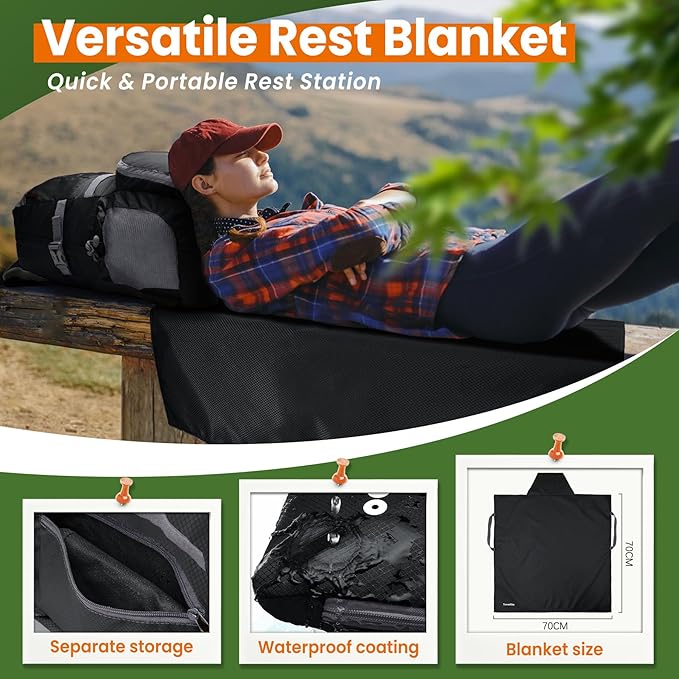 • Versatile Rest Blanket Included:Unpack the rest mat from the backpack and enjoy a comfortable break. The waterproof coating protects against water, dirt, and other elements, ensuring a clean and convenient rest or energy replenishment during your trip