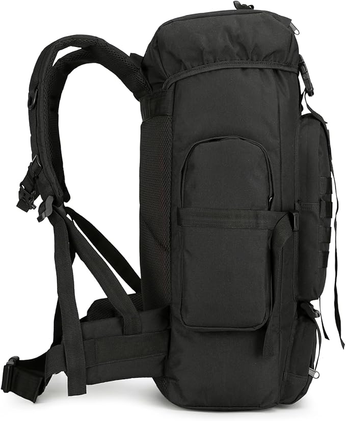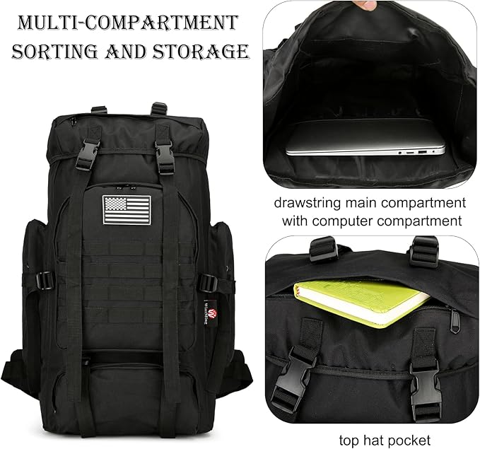 • 【45L Military Rucksack】The molle backpack size about 21" * 17" 4", military hiking backpack features spacious main compartment and front compartment, 2 side pockets, multiple intervals to keep your belongings organized. The main compartment designed with a drawstring to make it easier and faster to get things.