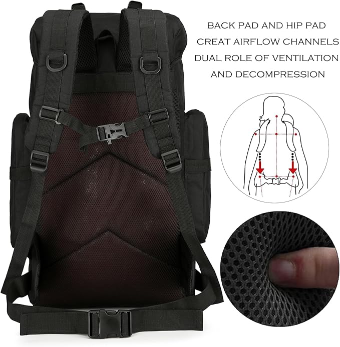 • 【Stable Material】The camping pack is made of stable 900D oxford fabric, water resistant, tearable and anti-scratch, all focus points are reinforced and multiple stitching, just to provide you with a loaded backpack for a pleasant and secure journey. (mild waterproof fabric, can not prevent heavy rain, need additional rain cover).