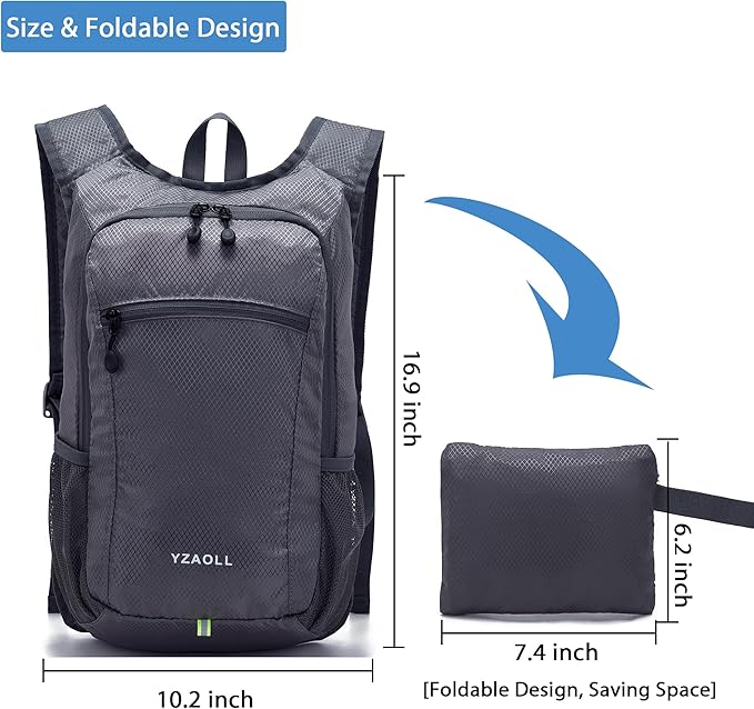 • ★【LIGHTWEIGHT & PACKABLE】: The packable backpack weighs only 0.4 pounds and can be easily folded into a small one for storage. The folded size is only 6.8 * 5.5 inch, which is not bigger than a notebook and takes very small space. Also serve as a good size for teenagers.