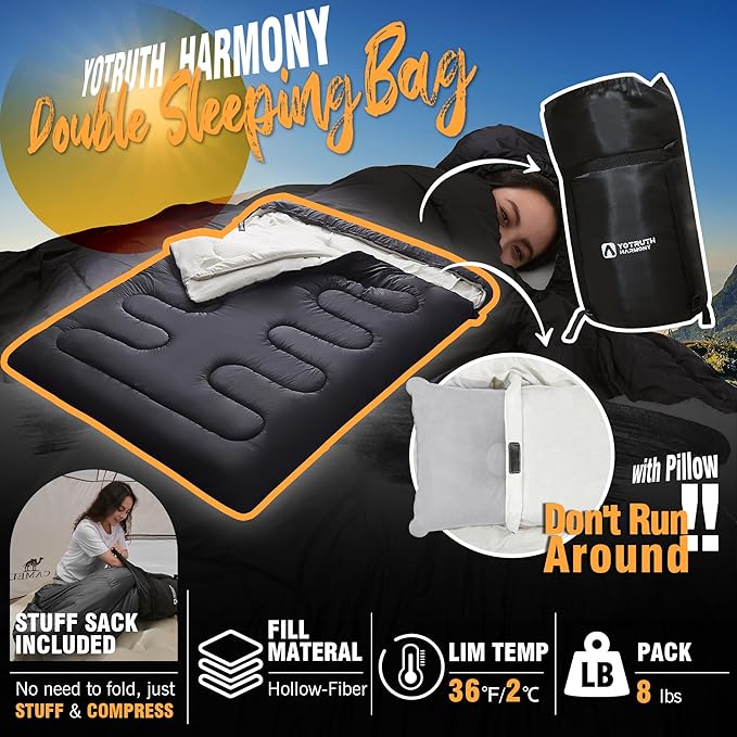 • 【Harmony series】The Harmony series camping sleeping bags is designed for family or couple car camping, sacrificing portability for enhanced comfort, allowing you to create a cozy sleep system for your loved ones during camping. Our sleeping bag is a camping essential for car camping.Protected by the yotruth Limited Lifetime Warranty.