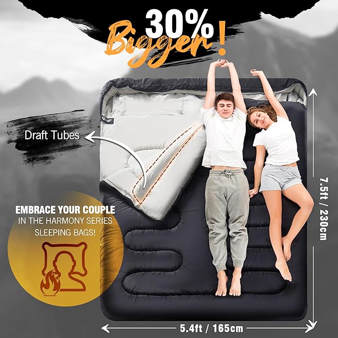 • 【Larger Size】Measuring 230cm in length and 165cm in width, ditch those constricting double sleeping bags for adults and enjoy a spacious and comfortable experience with your family in the Harmony sleeping bags for adults 2 person. We've designed two L-shaped zippers, allowing you to fully open the sleeping bag for more space.