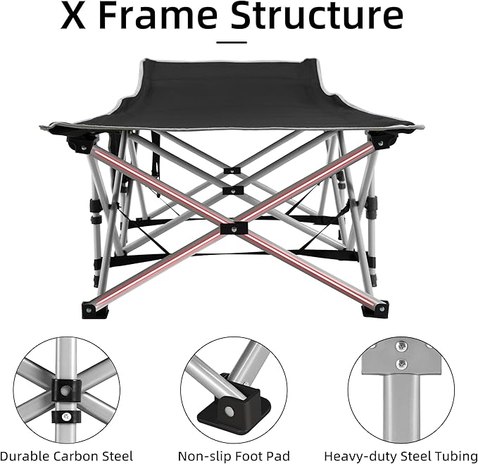 • Durable Structure & 600 Lbs Max Load: Fragess camp cot is constructed in a triangular shape and thicker steel. Each heavy duty cot leg has non-slip pads to ensure safety and stability. Folding camping cot can withstand 600 lbs, won't squeak or shake when you sleep, ideal sleeping cots for adults. Cot size:75 x 28 x 13.8 inch