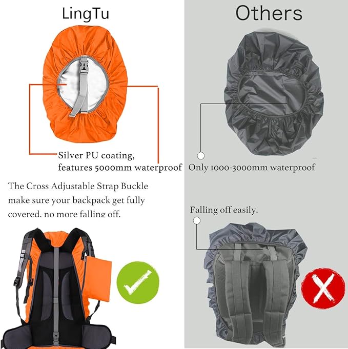 • - UPGRADED BUCKLE STRAP: Equipped with an upgraded buckle strap, this rain cover securely attaches to your backpack, preventing it from slipping or getting loose during your outdoor adventures.