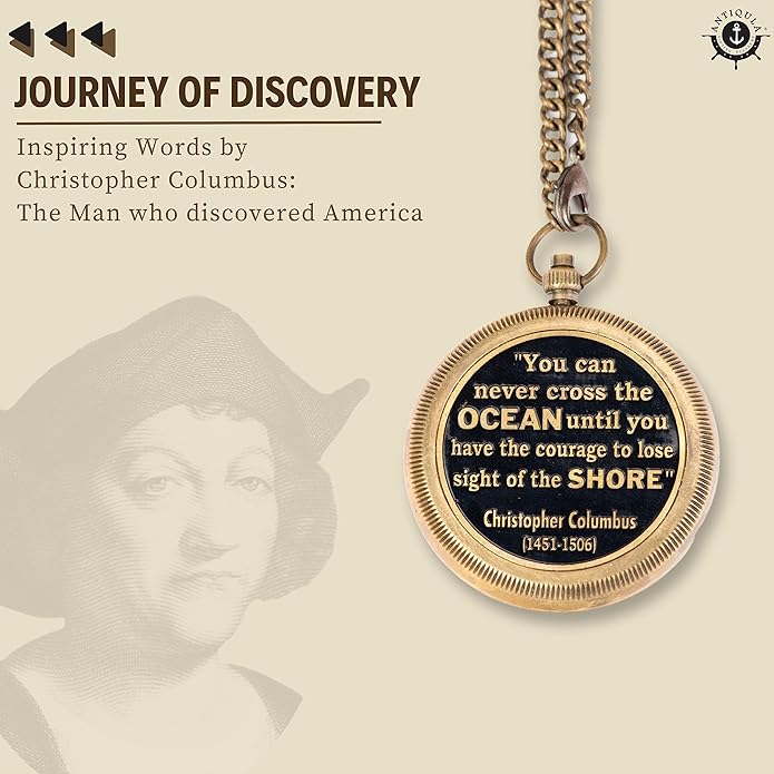 • ✔ EMBRACE INSPIRATION AND COURAGE: Introducing the captivating Columbus Compass—a vintage treasure. An ideal gift for dreamers and adventurers, it enchants with its timeless allure. Skillfully handcrafted, it showcases an engraved quotation by Christopher Columbus on its backside: "You can never cross the ocean until you have the courage to lose sight of the shore." Perfect for graduation gifts for boys, baptism gifts for boys, and confirmation gifts for teenage boys, and much more.