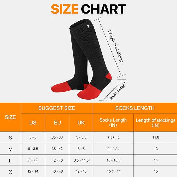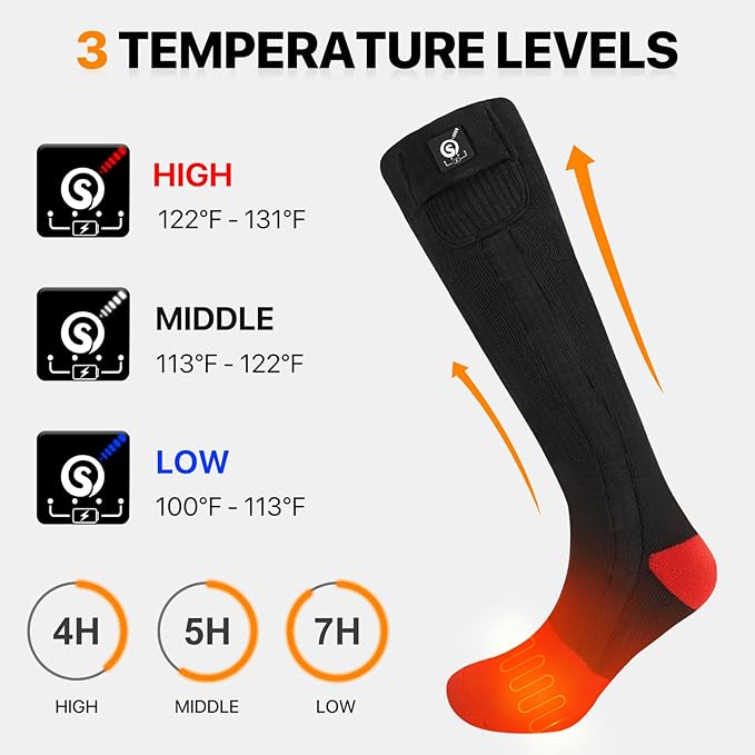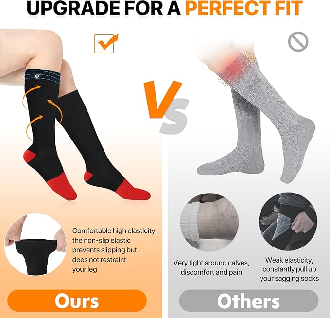 • 【Upgrade For A Perfect Fit】Heated socks increased wire softness by 10%, ensuring a more comfortable high elasticity. Prevent slipping but do not restrict your legs.