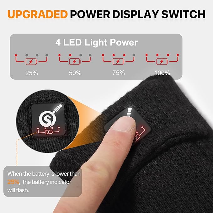 • 【Long Working Hours of Adjustable Heat】The electric heated socks can last for 2-7 hours. Upgrade switch with a power indicator, 3 levels of temperature adjustment can meet your warmth needs in different weathers.