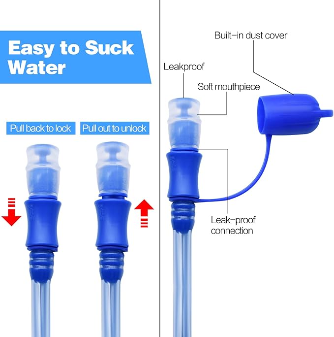 • 【Leakproof】- Hydration bladders adopt high quality double-sealing performance design which is leakproof. Silicone gasket on the end of the water pipe connection and the screw cap can prevent water seepage and leakage. Note: Pls screw the cap tightly to prevent water leakage.