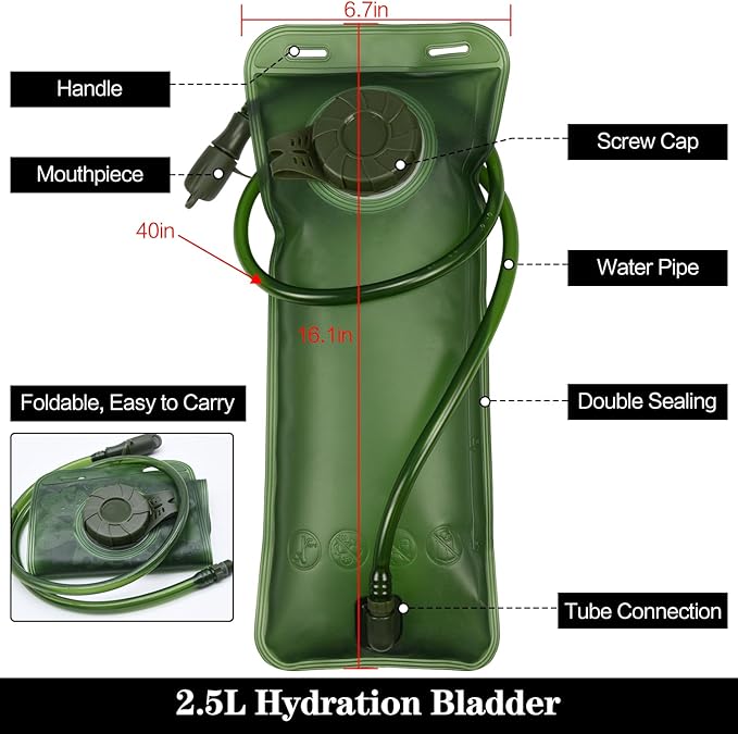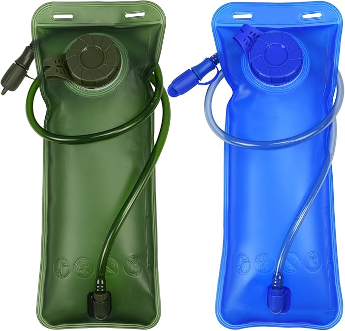 • 【2.5L Hydration Bladders】- You will get 1pcs blue hydration bladder, 1pcs army green hydration bladder and 2pcs suction pipe. 2L water bladder can contain water at -4°F to 122°F. Pipes provide a wholesome flow for easy drinking and keep you hydrated when hiking, climbing or running, etc.