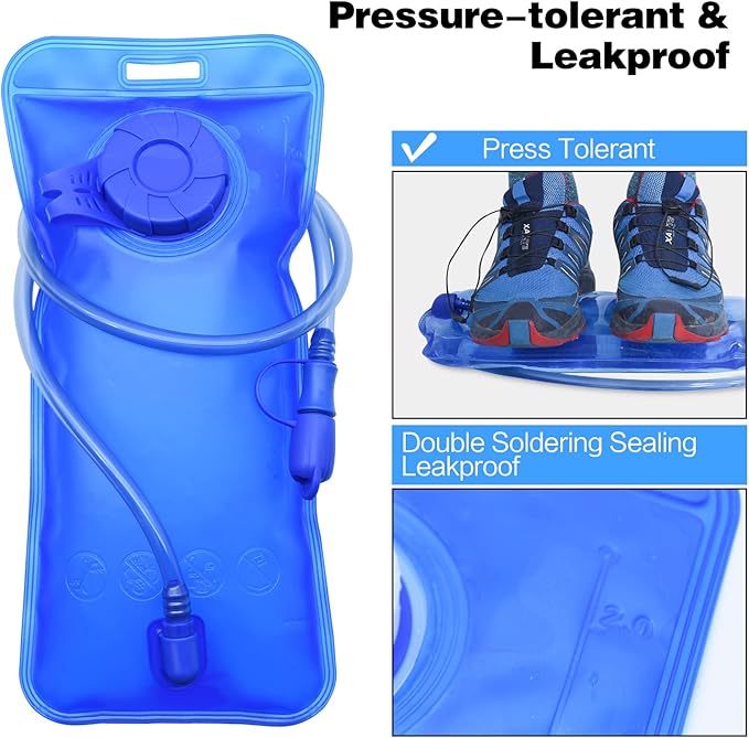 • 【Premium Material】- Hydration bladder is made of double-sided EVA material, it is odorless, tasteless, strong hydrolysis resistance, high strength and high water pressure resistance. The water bladder passed pneumatic pressure test, it is pressure-tolerant.