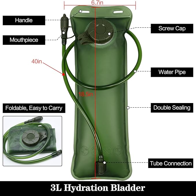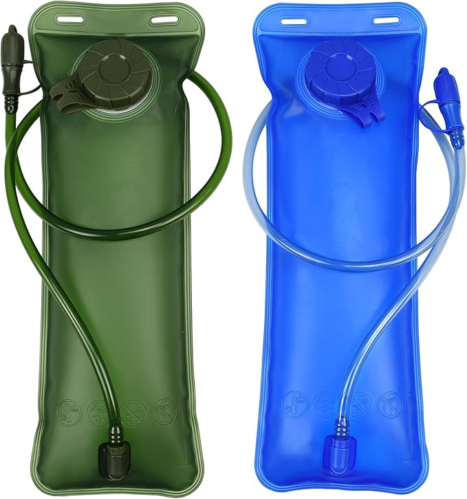 • 【3L Hydration Bladders】- You will get 1pcs blue hydration bladder, 1pcs army green hydration bladder and 2pcs suction pipe. 2.5L water bladder can contain water at -4°F to 122°F. Pipes (4in diameter, 40in length) provide a wholesome flow for easy drinking and keep you hydrated when hiking, climbing or running, etc.