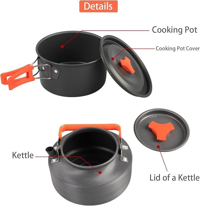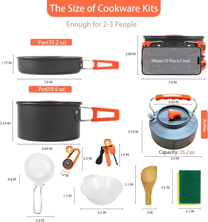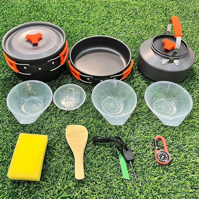 • The Best Money You Ever Spent - the 12pcs Camping Cookware Set Is Perfect for 1-2 People. Package Includes: 1*59.9oz Camping Pot with Lid (6.69*3.54 Inch),1*35.2oz Frying Pan(7*1.77 Inch),1*35.2oz Camping Kettle with Lid,3 Plastic Bowls ,1 Plastic Soup Spoon,1 Banboo Spatula,1 Cleaning Sponge,1x Net Bag for Storage, 1 Flient(3 colors randomly), 1 Mountainerring Buckle Compass(7 colors randomly).