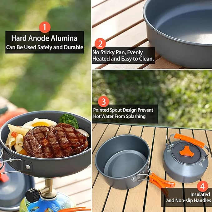 • Outstanding Quality and Service - We Are Committed to Providing Exceptional Product Quality and Attentive Customer Service. If You're Not Satisfied with Our Product, We Are Here to Assist You. Choose Our Camping Cooking Set and Make Your Outdoor Life More Exciting!