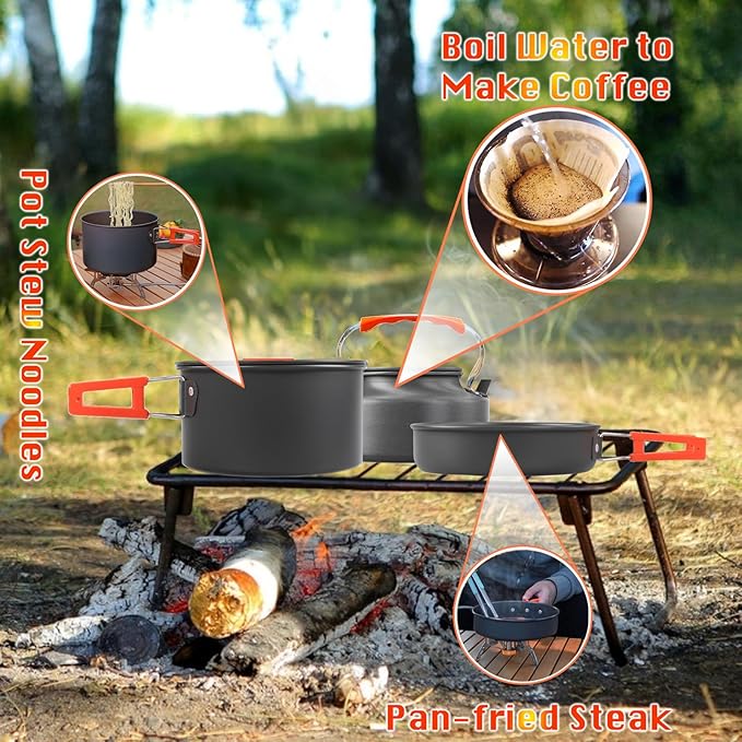 • The Best Camping Kitchen Set - Our Camping Cooking Set Is the Ideal Choice for Outdoor Activities. It Includes a Comprehensive Set of Cooking Tools, Such As Pots, Pans, Kettles, Multiple Transparent Bowls, Collapsible Soup Spoons, Rice Spatulas, and Cleaning Sponges. This Set Is Not Only Suitable for Boiling Water and Cooking But Also Perfect for Enjoying Delicious Camping Meals, and Handcrafted Coffee. So It's the Camping Gear Must Haves and Also for Rv Camping Must Haves.