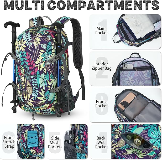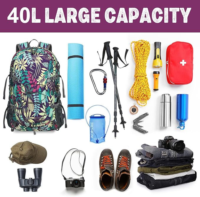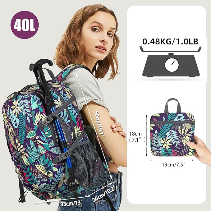 40L Lightweight Hiking Backpack Travel Packable Daypack for Women and Men, Purple Leaf
