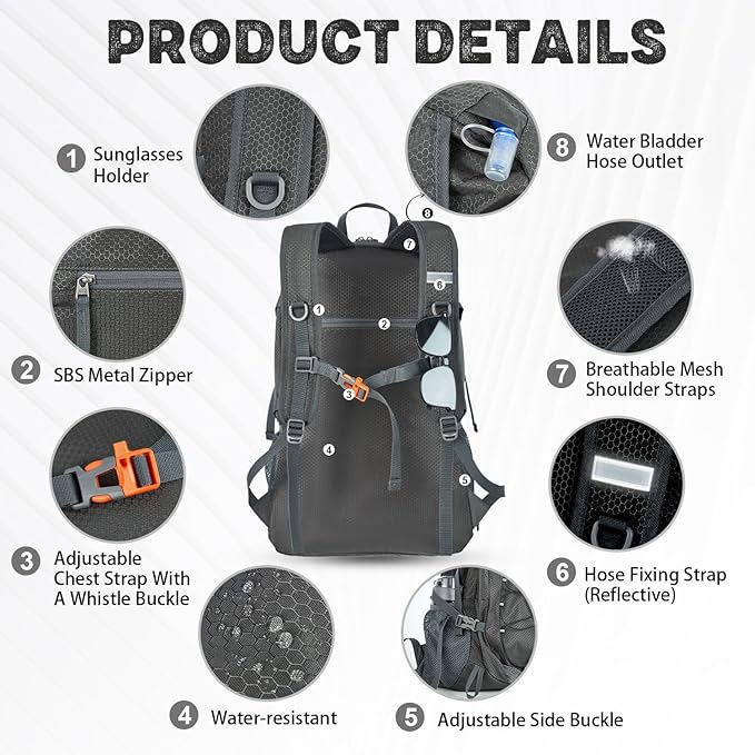• SAFETY-ORIENTED FEATURES: This outdoor backpack has essential features for emergency situations. It includes a lifesaving whistle, perfect for attracting attention in critical moments. The backpack has a water bladder hole for convenient hydration on the go and multiple reflective strips to improve visibility in low-light conditions.