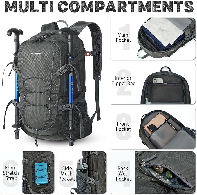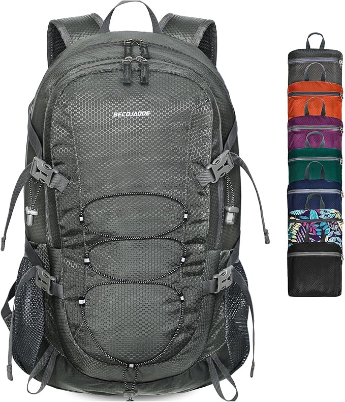 • SPACIOUS & WELL-ORGANIZED: The BECOJADDE packable backpack for travel boasts a sleek, minimalist design with multiple compartments and pockets for optimal organization. This camping backpack includes one main compartment, one wet pocket, one front zippered pocket, two side pockets, and an elastic drawstring. The wet pocket is extremely effective for keeping electronics clean and dry or separating wet clothes from other items.