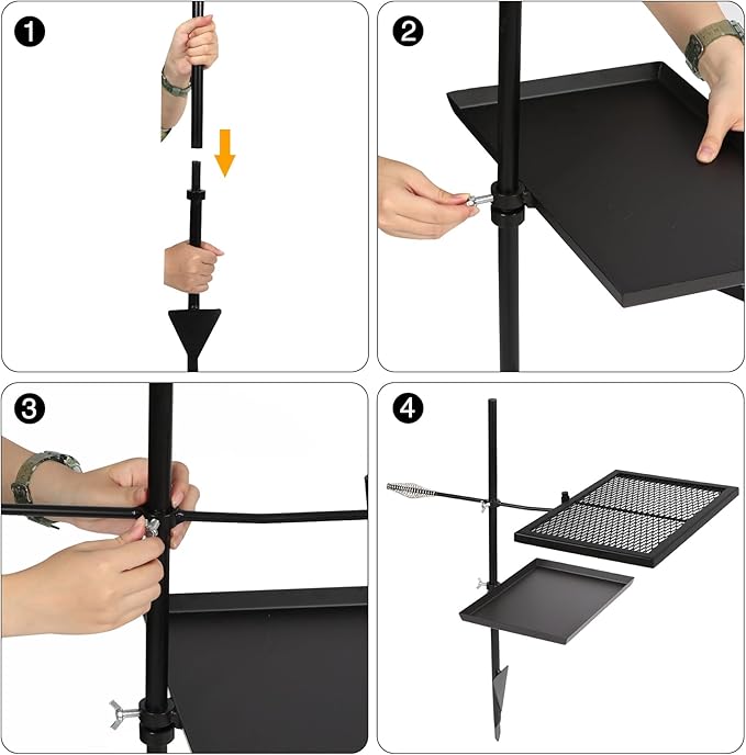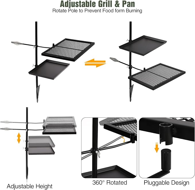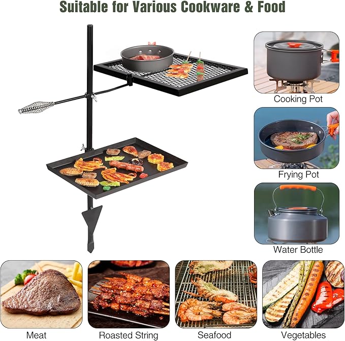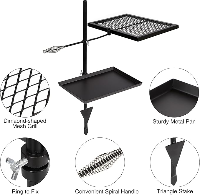 • Premium Material: The swivel campfire grill with grill pan is made of high quality iron material, which is durable and corrosion resistant. It has great fire resistance and hardness.