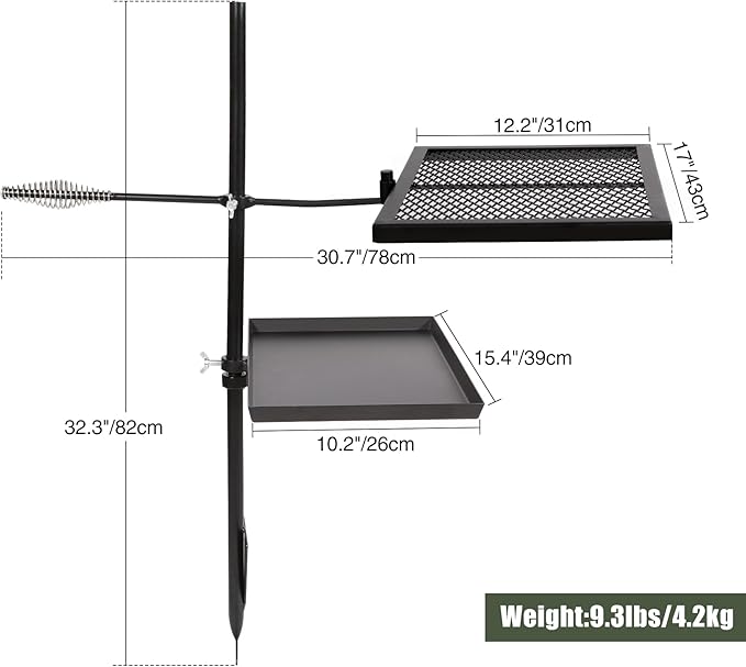 • Dimensions: The height of the campfire swivel grill is 32.3’’/82cm. The size of the grill grate is 17x12.2’’/43x31cm. The size of the grill pan is 15.4x10.2’’/39x26cm. The weight is 9.3lbs/4.2kg. It’s lightweight and compact, easy to carry with storage bag.