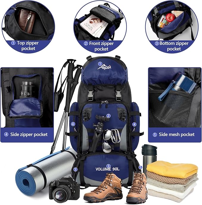 • 【Hiking Backpack Structure】: The 90L camping backpack main compartment is drawstring closed, hiking backpack roomy enough for your storage hiking gear, clothes and luggage, one bottom zipper pocket can store shoes separately from the clothes in the main pocket. Two side mesh pocketes are suitable for placing cups and umbrellas. This mountaineering backpack has one front zipper pocket and two side pocketes for separate and orderly storage.