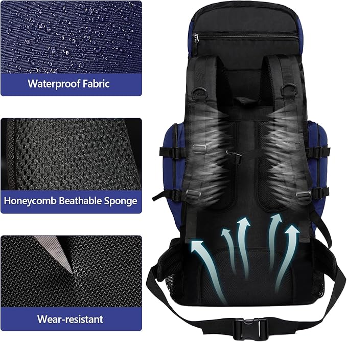 • 【Camping Backpack Features】: Ade of high quality nylon fabric for durability, life waterproof and tear resistant. To keep your product out of the water, we have specially equipped a rain cover to prevent water and dust from entering the backpack, protecing your valuables from rain and keeping everything dry.