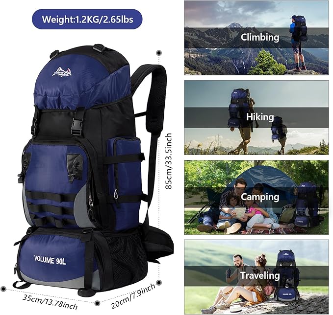 • 【Large Capacity Rucksack】: The 90L Large Capacity Hiking Backpack only 2.65 pounds for easy carrying, adding no burden to your travel. The maximun loading bearing is 45lb. Unfold size: 20*35*85cm/7.9*13.78*33.5in(L*W*H). Perfect size for camping backpack, hiking backpack, trekking backpack, traveling, hunting, fishing.