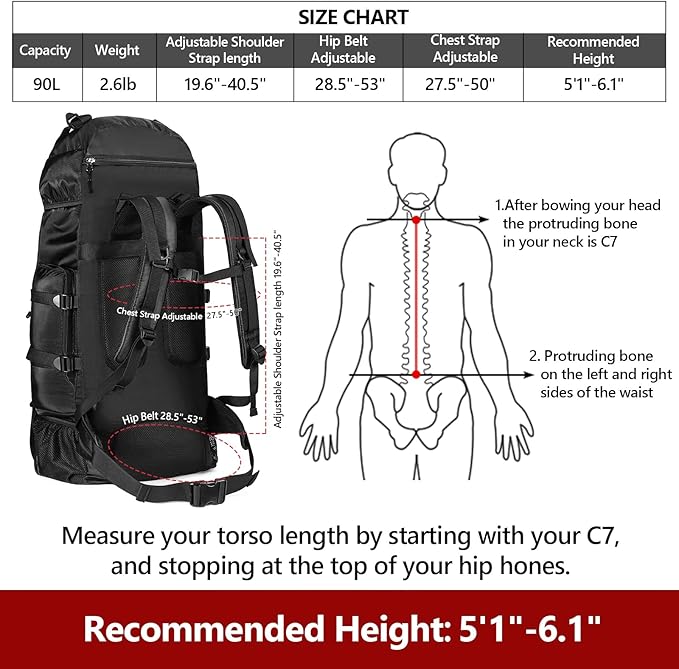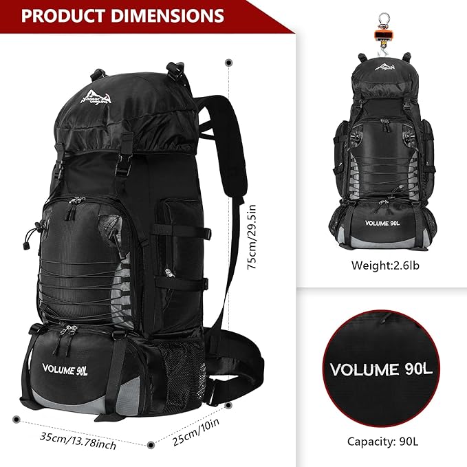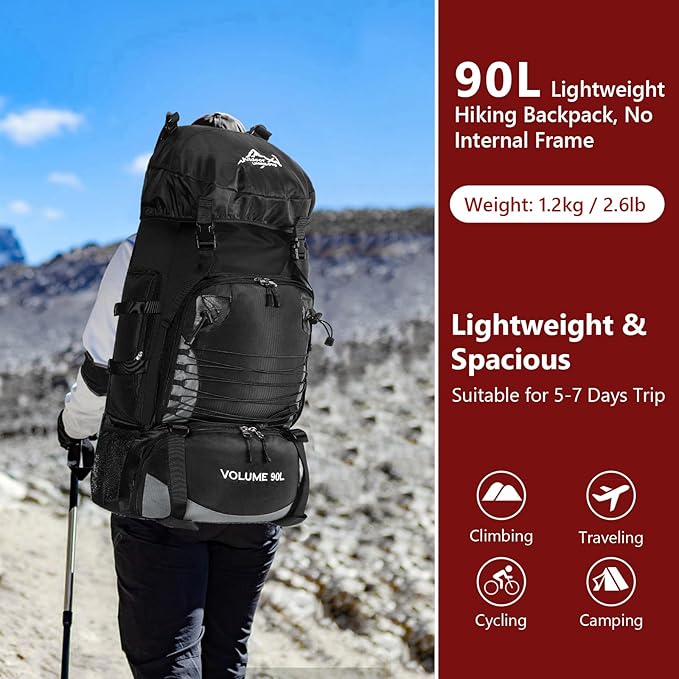 • 【Ideal & Outdoor Companion】: 90L ultra lightweight hiking backpack, only 2.6 pounds, no internal frame, reduces the load weight of backpack, allowing you to carry more other items. 90L large hiking backpack size: 75x35x25cm/ 29.5x10x13.8x inches. Enough for a 5 or 7 days trip. The maximum loading bearing is 45lb. Suitable for travel, hiking, mountaineering, camping and everyday use. Note: Please confirm the product size indicated on this page before ordering.