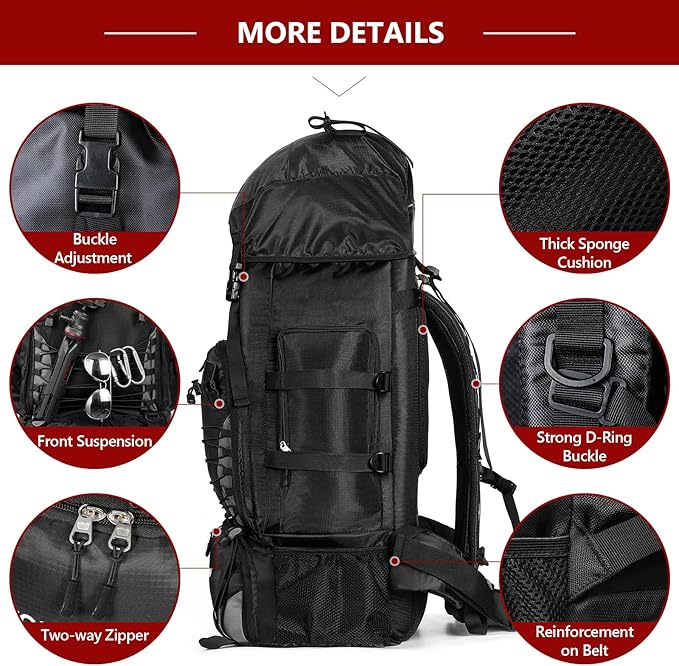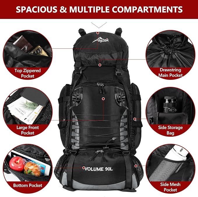 • 【Large Capacity & Multicompartment】: 90L travel backpack is designed with spacious main pocket and multiple compartments for easy storage. The hiking bag has 8 large compartments, Including 1x top pocket, 1x drawstring main pocke, 1x front pocket, 1x shoes bottom pocket, 2x side water bottle pockets, 2x side ziper pockets. Partition storage, easy to store, more tidy!