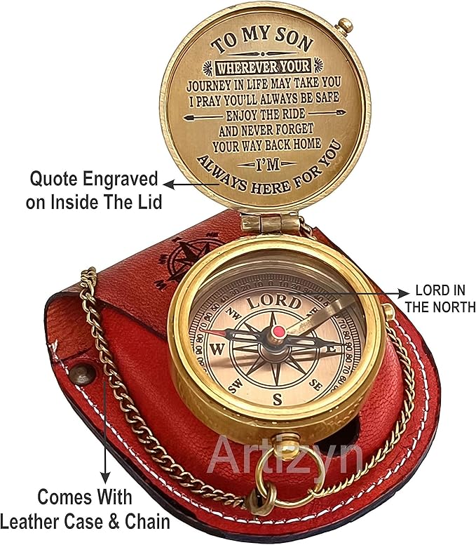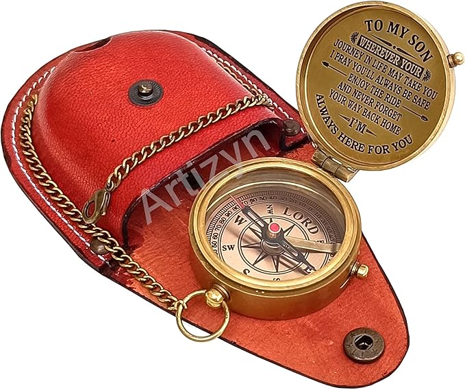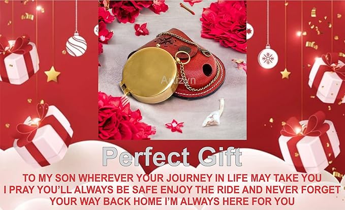 • Antique brass compass is corrosion resist, packed in a hand stitched Stamped Leather case with Engraved Quote "TO MY SON WHEREVER YOUR JOURNEY IN LIFE MAY TAKE YOU I PRAY YOU’LL ALWAYS BE SAFE ENJOY THE RIDE AND NEVER FORGET YOUR WAY BACK HOME I’M ALWAYS HERE FOR YOU” Under the tough glass cover is a beautiful, which will help you find and navigate your way to home.
