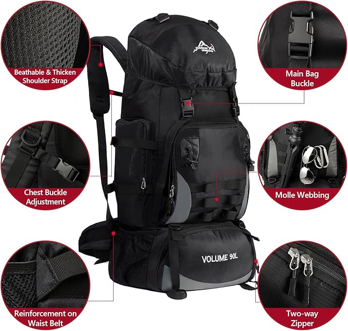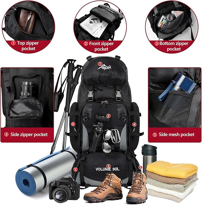 • 【Hiking Backpack Structure】: The 90L camping backpack main compartment is drawstring closed, hiking backpack roomy enough for your storage hiking gear, clothes and luggage, one bottom zipper pocket can store shoes separately from the clothes in the main pocket. Two side mesh pocketes are suitable for placing cups and umbrellas. This mountaineering backpack has one front zipper pocket and two side pocketes for separate and orderly storage.