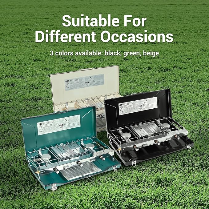 • PORTABLE: This 3-burner portable camping stove comes with a carry handle that allows you to carry it conveniently. It has a compact structure and weights only 10lbs which makes it even easier to carry it around. It can be taken along in a luggage or storage box, or even large tote bag, so carrying this portable propane camping stove is a breeze thing to do! Size: 23.4”x12.8”x3.4", Weight:9.9 LB