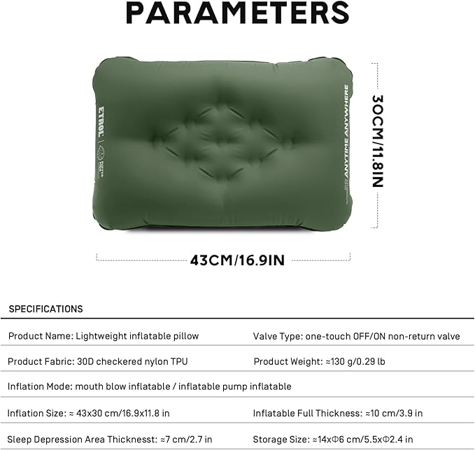 • WEAR-RESISTANT AND COMFORTABLE - The surface layer of the durable sleeping pillow is a high-density 30D checkered nylon TPU material, which is both soft and skin-friendly, and wear-resistant and tear-resistant. The inner layer has TPU film layer, airtight stronger not to leak, and waterproof and moisture-proof role.