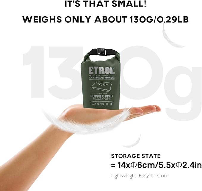 • ULTRA LIGHT & PORTABLE - The lightweight Travel Pillow weighs only 130g/4.6oz, Lighter than a bottle of water. With storage size of 14x6cm/5.5x2.4in, the Pillow fits easily in the palm of your hand and occupies only a small corner of your backpack, so you can't feel its presence when not in use.