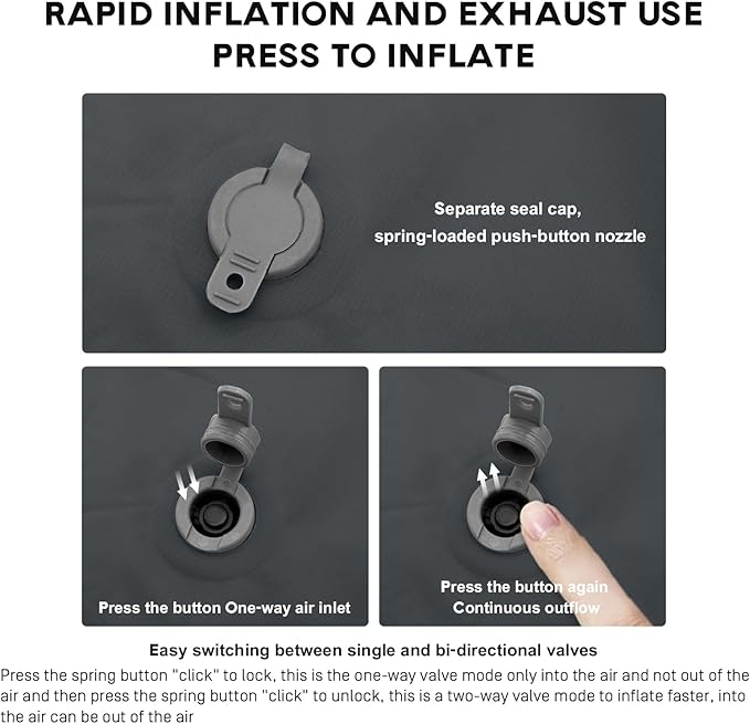 • FAST INFLATION & DEFLATION - Configured with 2.5cm adjustable inflation valve port, press the button can be one-way air intake, the inflatable process will not leak, can easily and quickly blow with the mouth to complete the inflatable. Press the button again, that is, continuous air out, fast discharge of air.