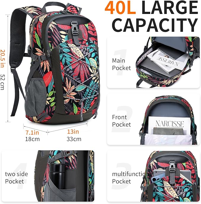 • Lightweight Backpack: Outdoor Backpack with 40L storage space(20.5inch x 13inch x 7.1inch), this backpack features with multi-compartment design includes one main zipped compartment, one zipped front pockets and two side pockets. One separated and one small zippered pocket in the main compartment are convenient enough to help you further organize things.Large capacity helps you easily organize all your essential items.