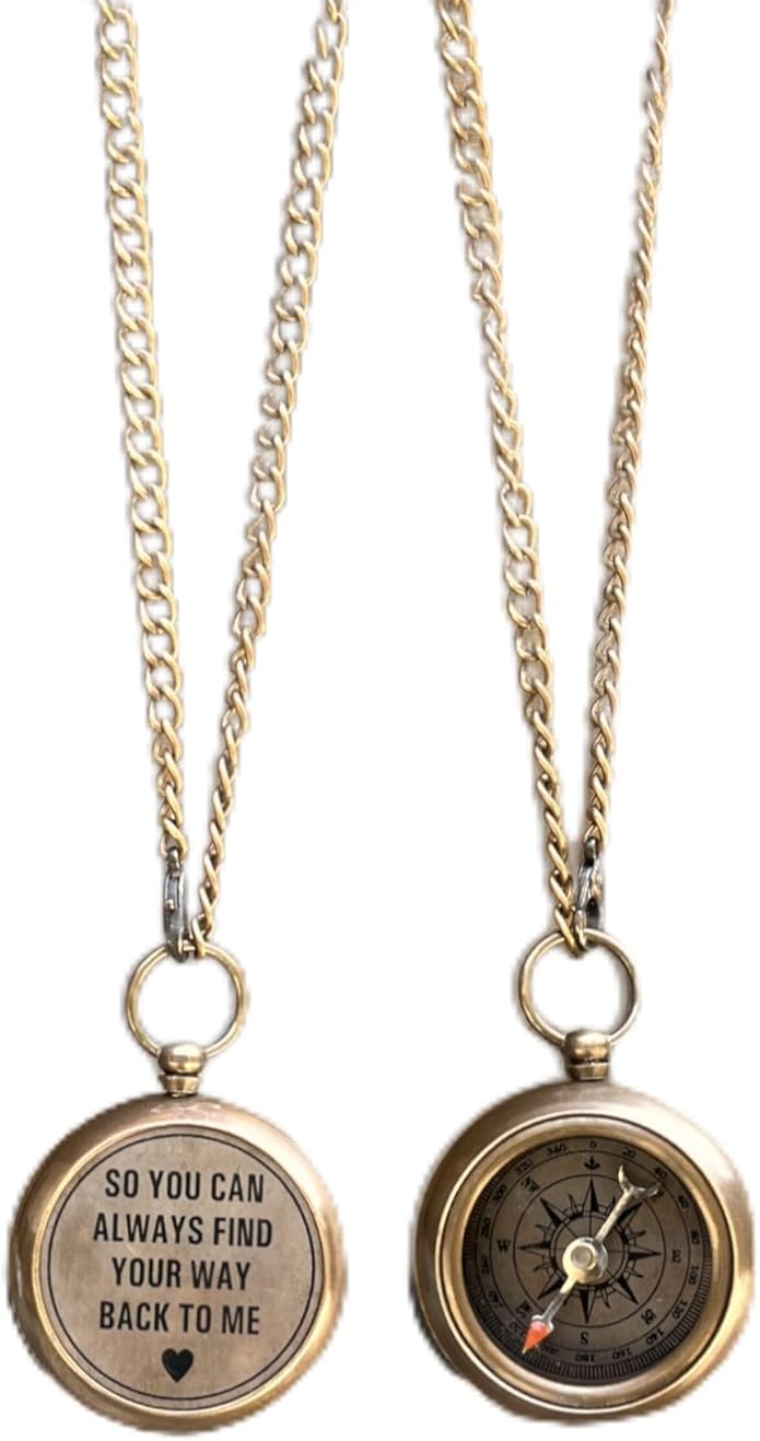 • Introducing the exquisite Brass Compass Necklace, featuring a unique and sentimental design that is sure to captivate the hearts of all. This necklace boasts a stunning brass compass pendant, delicately crafted to perfection, with a special inscription on the back side that reads. The pendant is suspended from a durable and elegant chain, ensuring a comfortable and secure fit for the wearer. The necklace is not only a stylish accessory, but also a meaningful keepsake that conveys a h