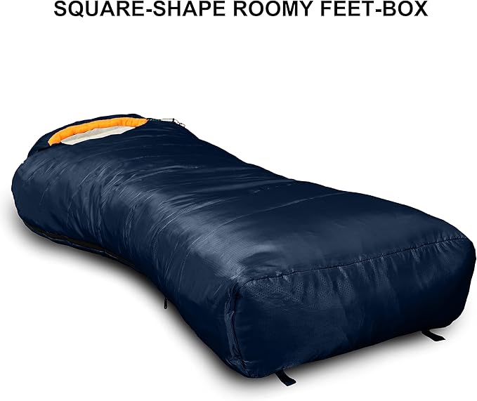 • OVERSIZED DIMENSIONS FOR ALL CAMPERS: No need to feel cramped! Our extra-long (90.2 inch) and wide (37.5 inch) sleeping bag accommodates all sizes, providing a spacious interior for a restful night's sleep. Whether you're camping, traveling, or hiking, the added comfort of a roomy square feetbox means more room to stretch out and relax in a natural sleeping position and more warmth where you need it