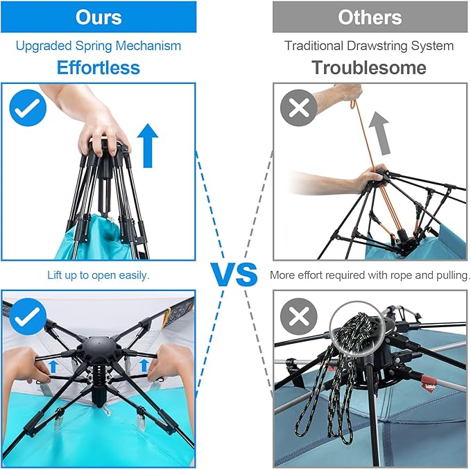 • Easy Setup & Super Stable: The specially designed spring opening system shows an industry-leading level of improvement. One person can set up the beach tent easily in seconds. Compared to the drawstring design, this one is faster, effortless, and saves more time. The 8.5 mm thick fiberglass poles make the tent stronger. Equipped with 3 sandbags, 4 wind ropes and 10 stakes to ensure stability and prevent it from being blown away in the wind.