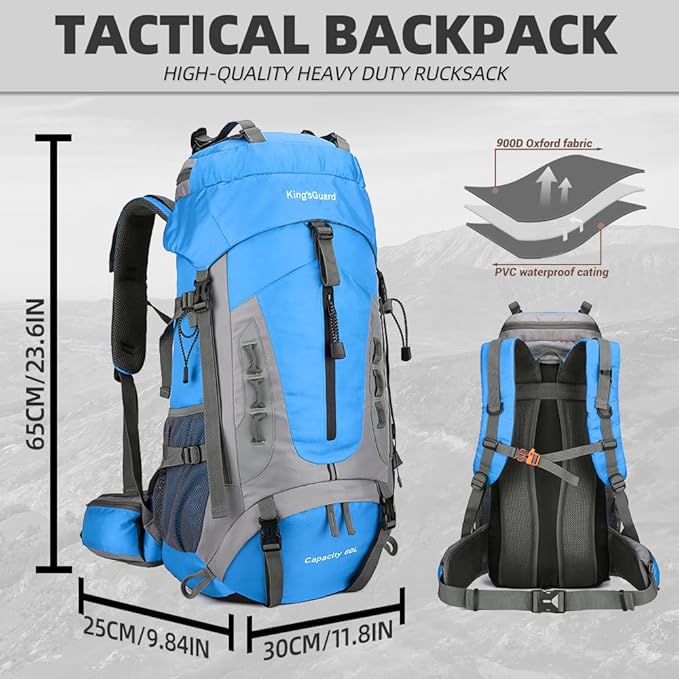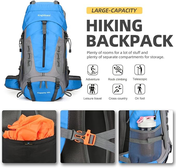 • 【High Quality Outdoor Backpack】- Choose the kings guard 60l backpack for your outdoor adventures and enjoy the perfect blend of functionality, durability, and comfort. This large hiking backpack is not only perfect for hiking and camping, but also great for travel, backpacking, and other outdoor activities. 【ONE YEAR QUALITY SUPPORT】
