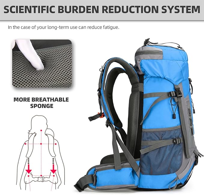 • 【Large Capacity】- With a spacious 60 liter capacity, this lightweight hiking backpack is designed to accommodate all your outdoor essentials. The multiple pockets and compartments provide organized storage for your gear, clothing and shoes. The 60l hiking backpack also comes with a rain cover to keep your belongings safe and dry even inthe rain.