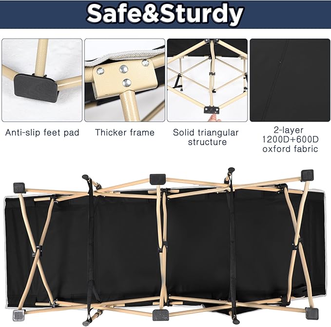 • Easy Assembly and Disassembly: featuring a foldable steel shock cord pole structure, our collapsible camping cot offers easy assembly and disassembly; With straightforward instructions and intuitive design, you can set up your cot bed within minutes, making it ideal for camping enthusiasts