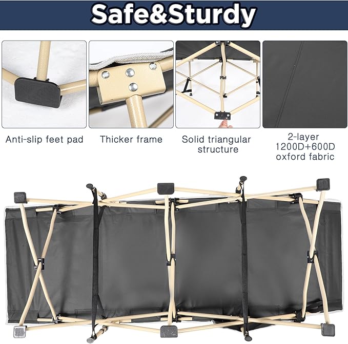 • Easy Assembly and Disassembly: featuring a foldable steel shock cord pole structure, our collapsible camping cot offers easy assembly and disassembly; With straightforward instructions and intuitive design, you can set up your cot bed within minutes, making it ideal for camping enthusiasts