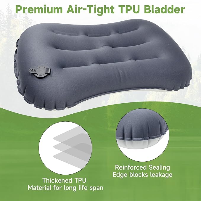 • 【EXCELLENT DURABILITY & NON-SLIP DESIGN】 No more air leaks from this inflatable camping pillow. Comes with a separate bladder made from thickened TPU material which prevents air leaks effectively. The extra removable elastic strap will prevent the inflatable air pillow for camping from moving around while sleeping.