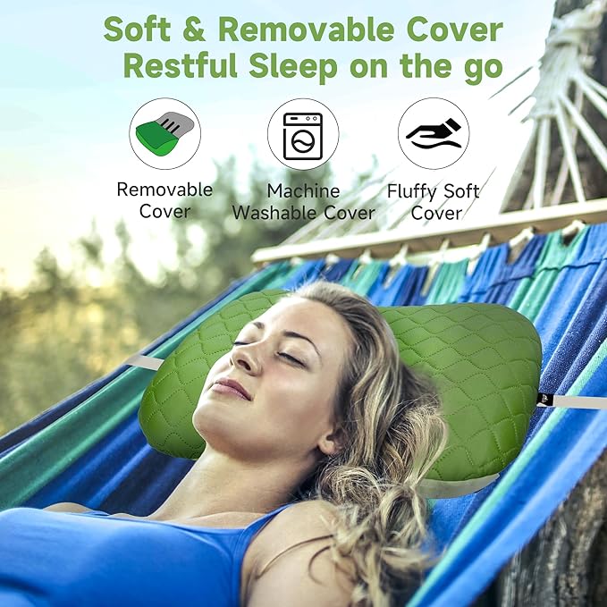 • 【SOFT & REMOVABLE WASHABLE COVER】 More comfortable with a soft and removable pillow cover. To provide a better camping sleeping experience, this inflatable pillow cover is made of soft, skin-friendly and breathable fabric. Also the cover could be simply removed and washed for easy care.
