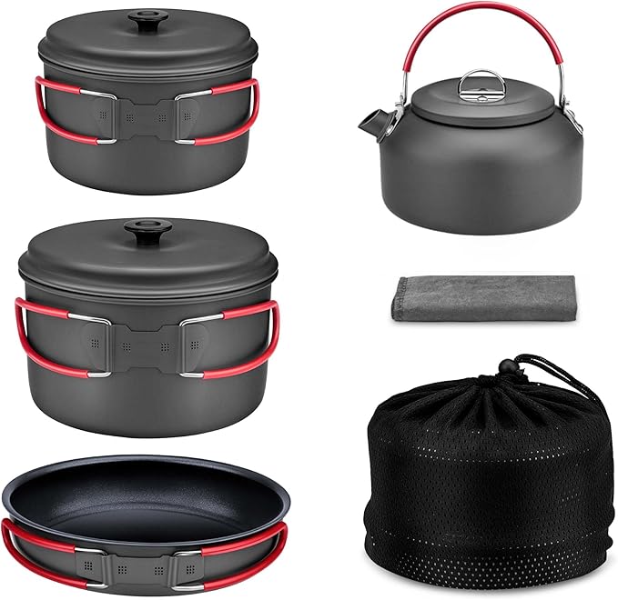 • SAFETY & EFFICIENT HEATING: Aluminum boasts better thermal conductivity than iron or titanium, allowing the camping pot heat up quickly and evenly. This not only reduces cooking time but also saves energy and fuel, making your outdoor cooking experience effortless and enjoyable. This camp cooking set is lightweight and durable, making it convenient for your camping trip while also guaranteeing excellent cooking results.