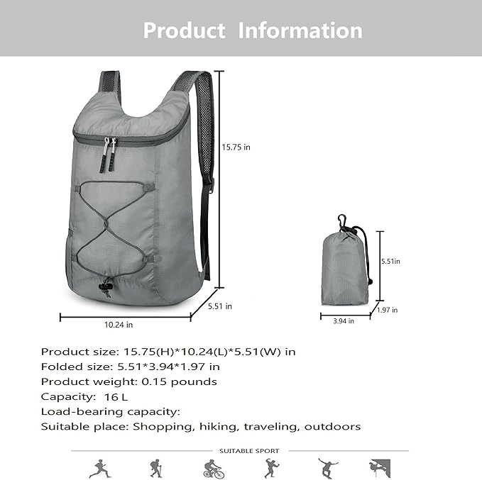 • LIGHTWEIGHT &16 L CAPACITY:The lightweight hiking daypack weighs only 2.82 ounces.unfold size: 10.23 (L) * 15.75(H)*5.51(W)inches,after folding size: 3.94(L)*5.51(H)*1.97(W)inches,the bag folds to the size of a sandwich and fits in a pocket.The main pocket to carry what you need,side pockets for water bottles or umbrella.