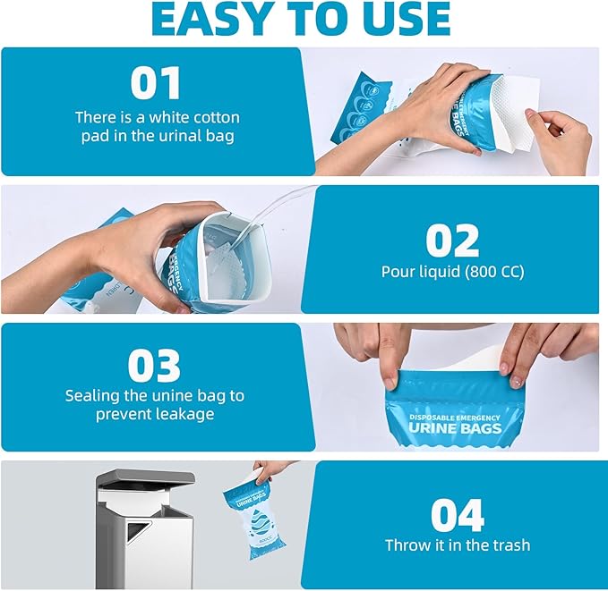 • 【Easy to use】Opening the urination bag, please double-check a white absorbent cotton pad inside it, which can turn urine into an odorless gel within 40 seconds . After using, please seal it and throw urine bag in the trash.