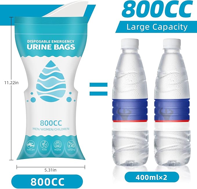 • 【Robust sealing, large capacity】800ml large capacity disposable unisex pee bag, which is ample for all people in emergency since the urine volume of an adult is about 400ml at a time, each packaging bag has a tight sealing pinch strip to prevent leakage,so no need worry about any inconvenience.